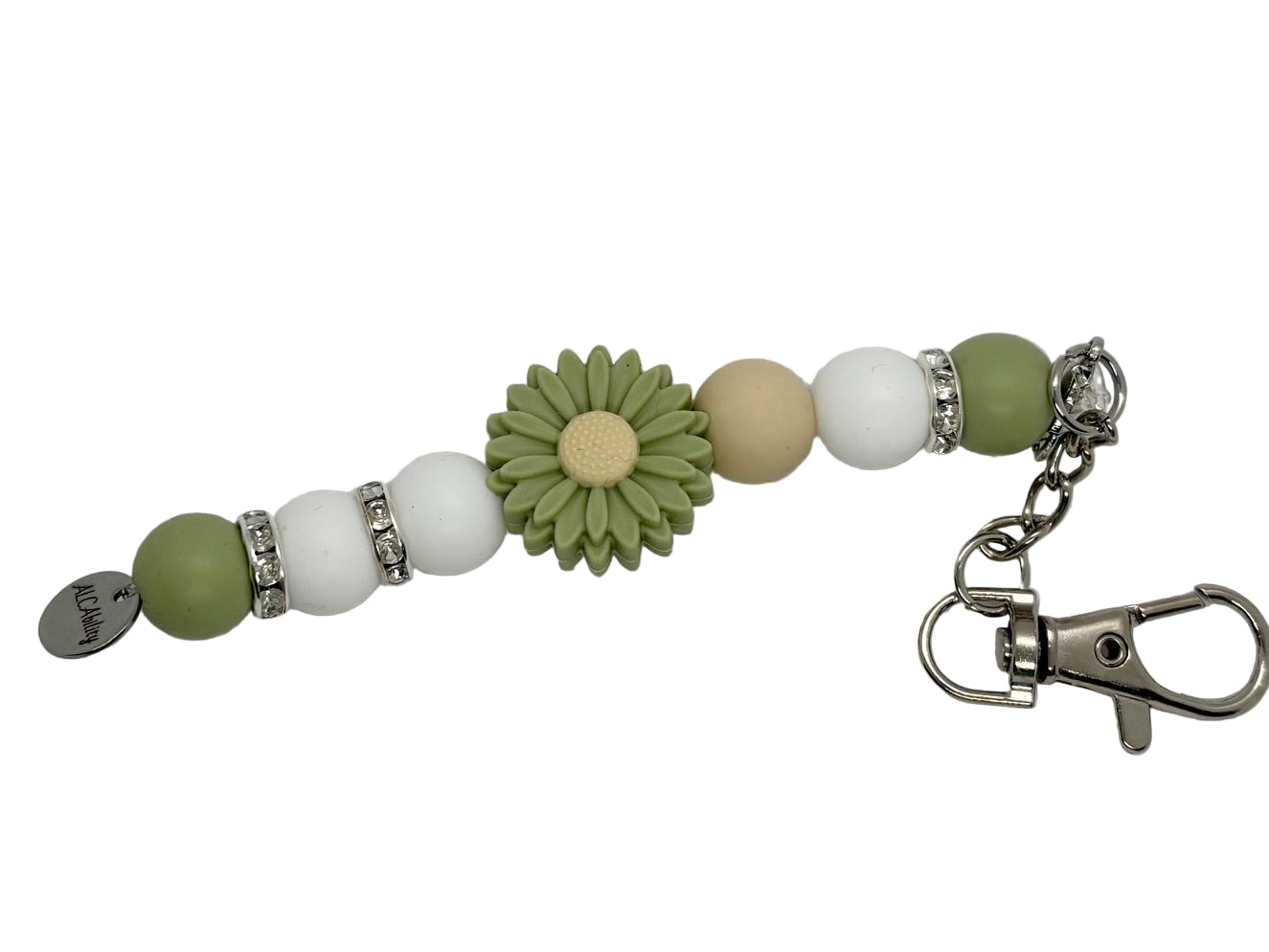 This keychain is made by Jasmine.  She has named it after Princess Jasmine from the Disney movie Aladdin.  It is made from silicone beads, has a flower centerpiece and is accented an ALCAbility charm.  Each piece has tones sage, cream and tan. The color design has been uniquley chosen for each one by Claudia.