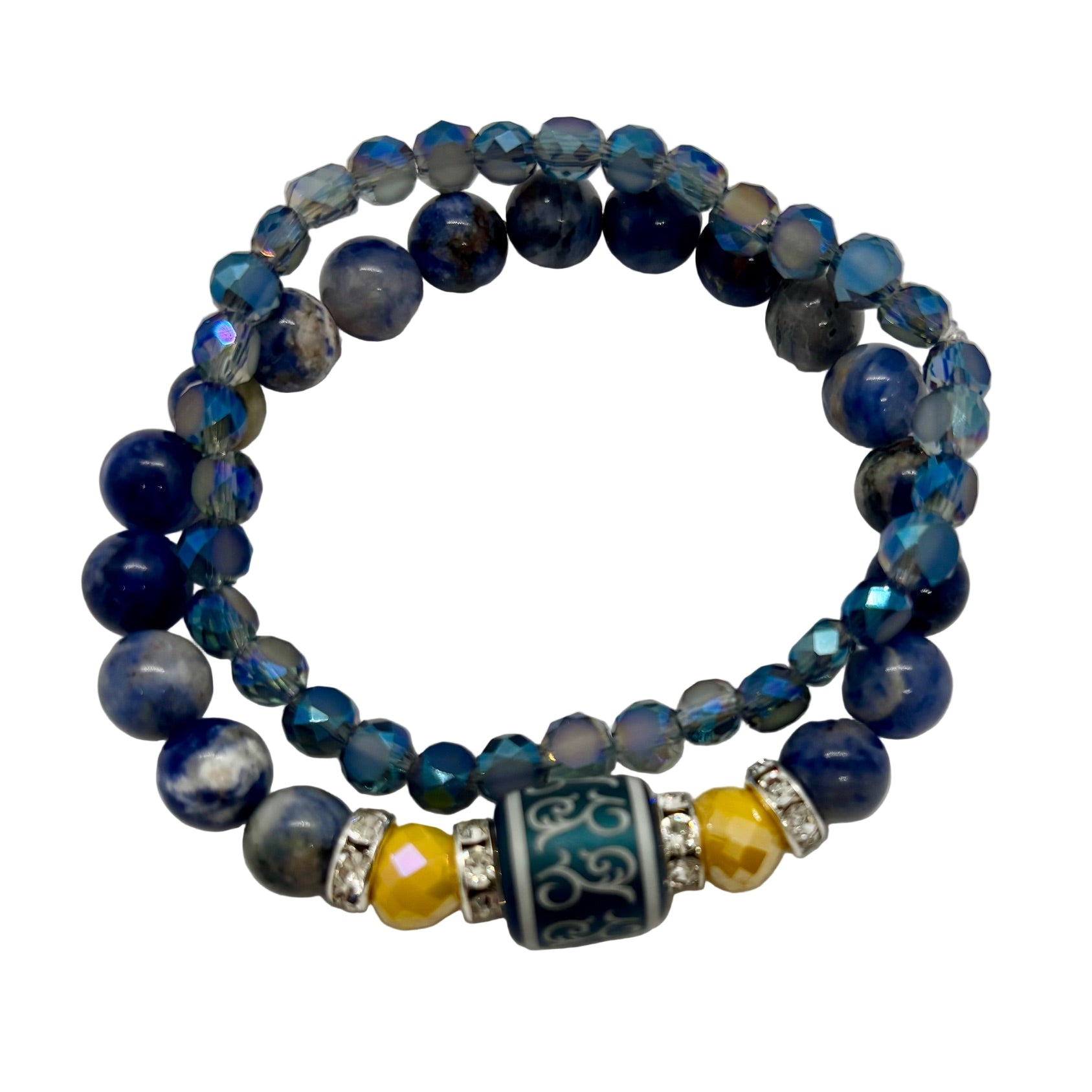 This is Evan's second design. He chose blue and yellow for this design. Evan describes his bracelet as "shimmering and fancy. It is accented with yellow beads." The ALCAbility charm helps you show your ALCA pride!